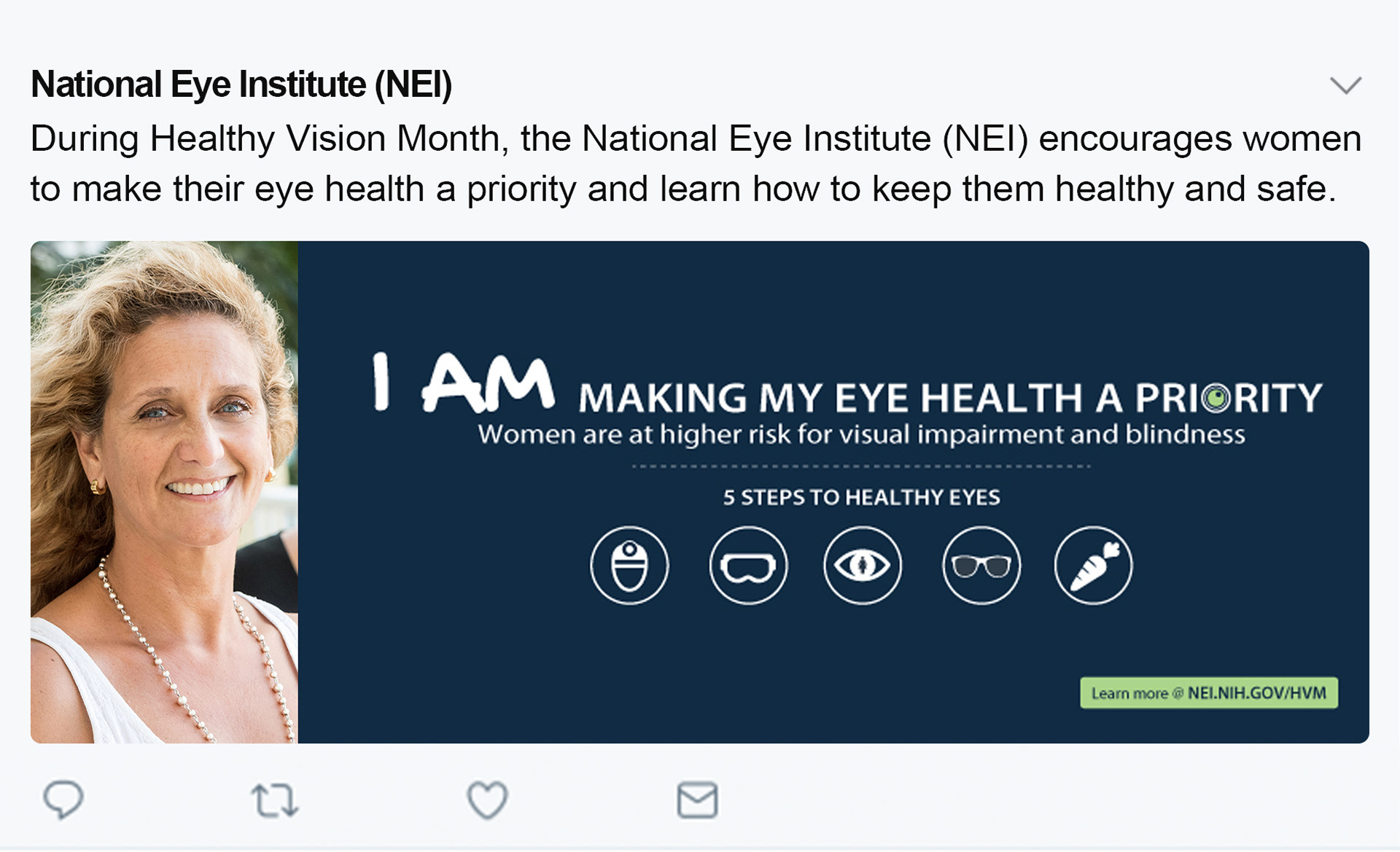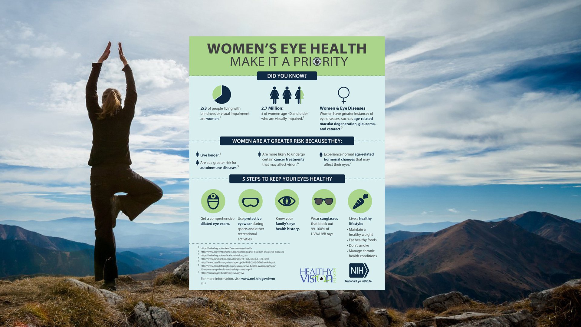 During Healthy Vision Month, NEI encourages Americans to make their eye health a priority and learn how to keep their eyes healthy and safe.